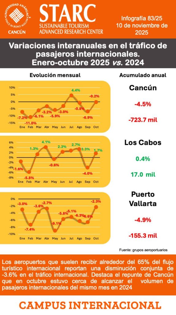 Cancún, 11 de noviembre. – El flujo de pasajeros internacionales en los tres aeropuertos de mayor perfil turístico de México (Cancún, Los Cabos y Puerto Vallarta) registró una disminución conjunta de 3.6% en el periodo de enero a octubre de 2025 respecto al año anterior, según datos recopilados por el Sustainable Tourism Advanced Research Center […]
